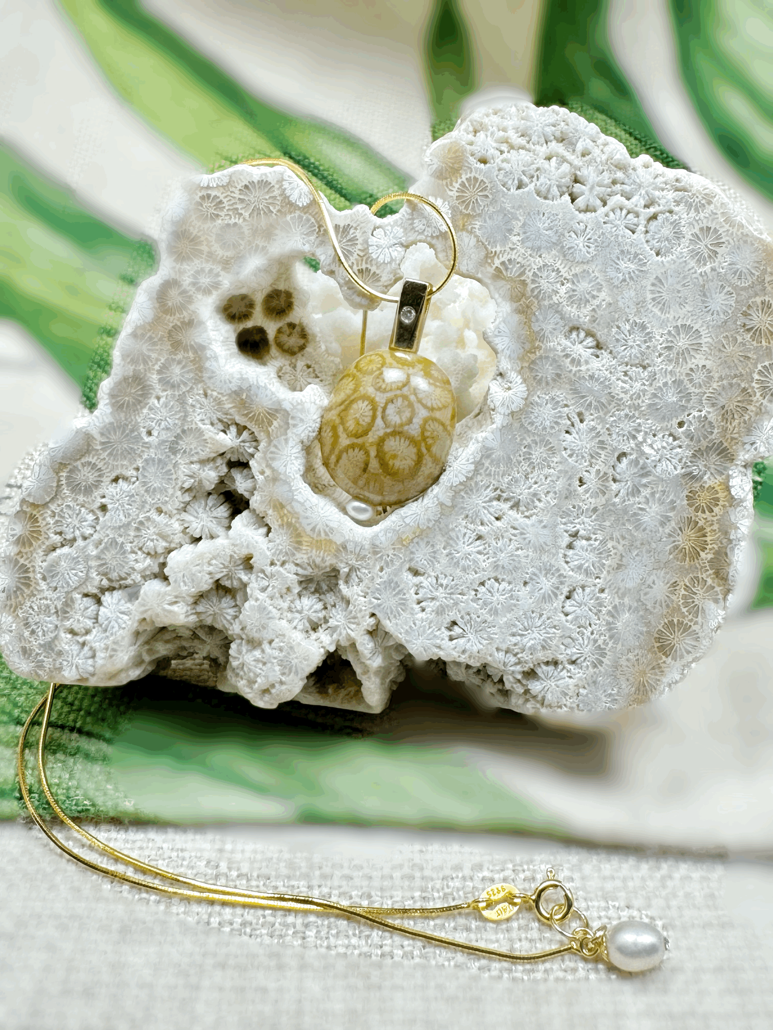 Necklace Material: Natural Coral Fossil Stone / 14K Gold-plated 92.5 Sterling Silver and freshwater pearls